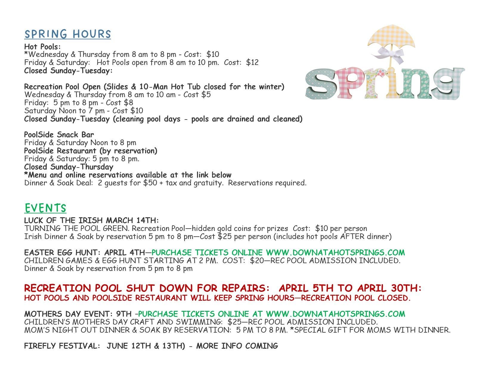 Memorial Day Weekend. Friday Night: Pool & Hot Pools Only 5 pm to 8 pm
