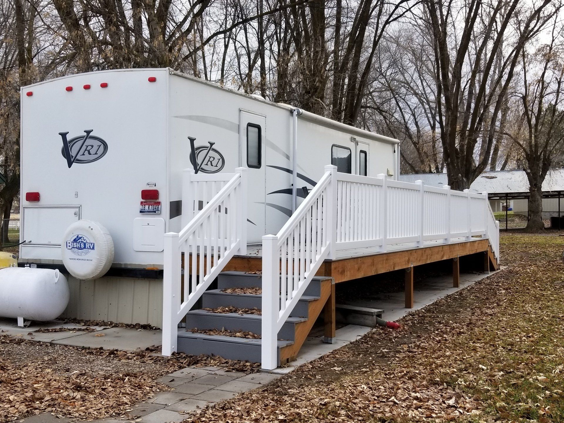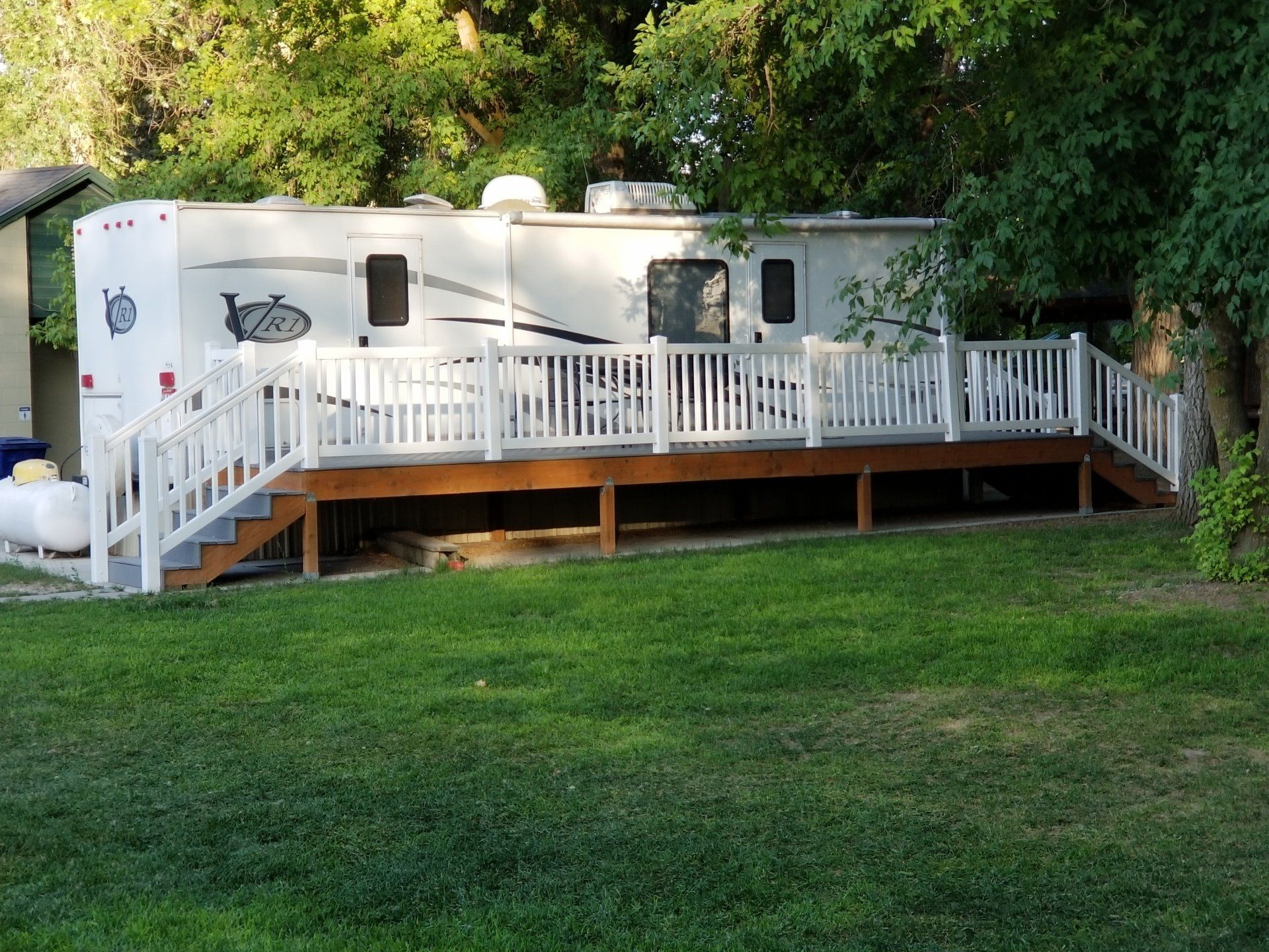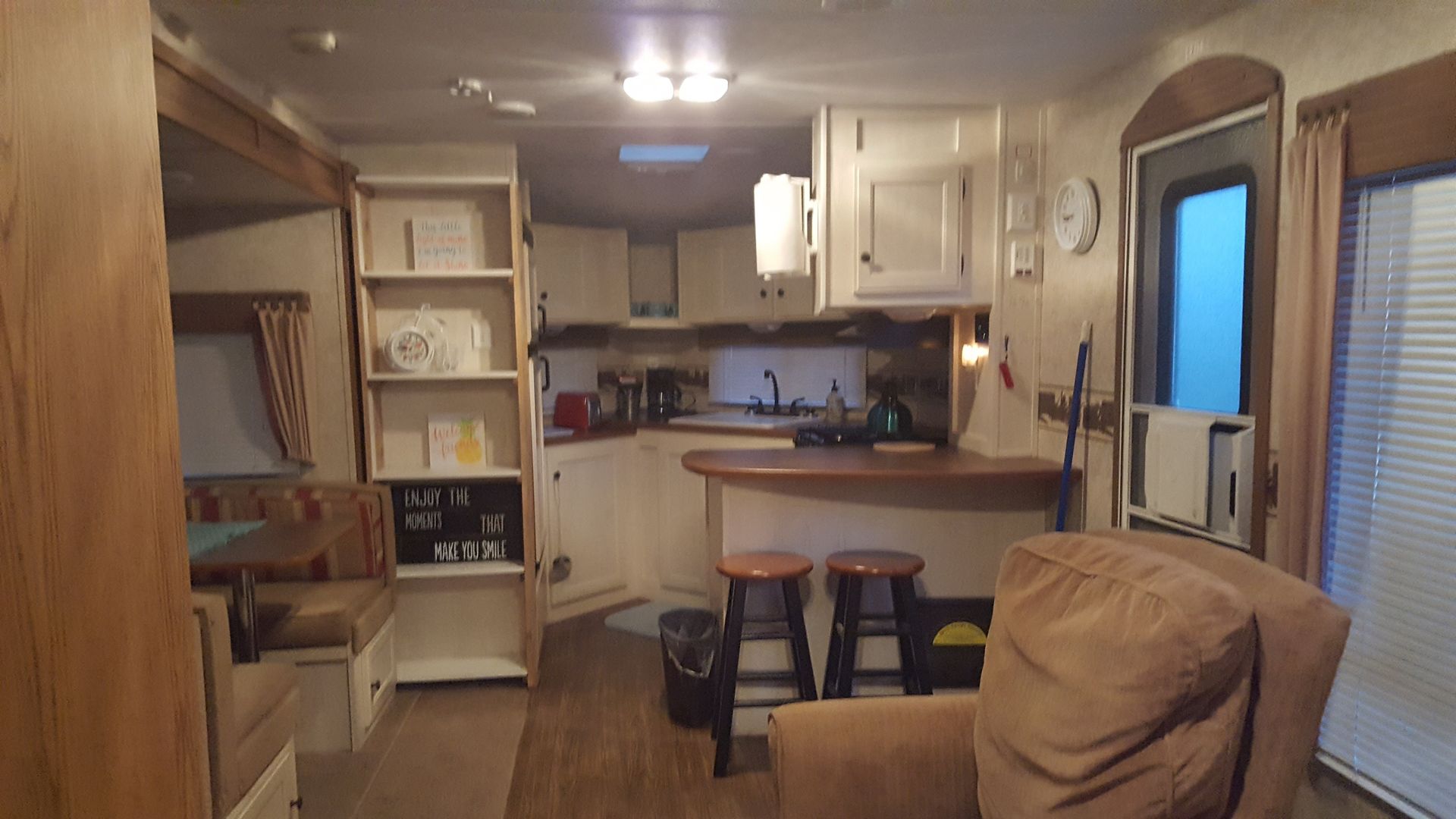 Sleeps two people. Located in the main tenting area. RV Trailer has bedding, bathroom, kitchen with dishes, fire pit outside. This trailer is